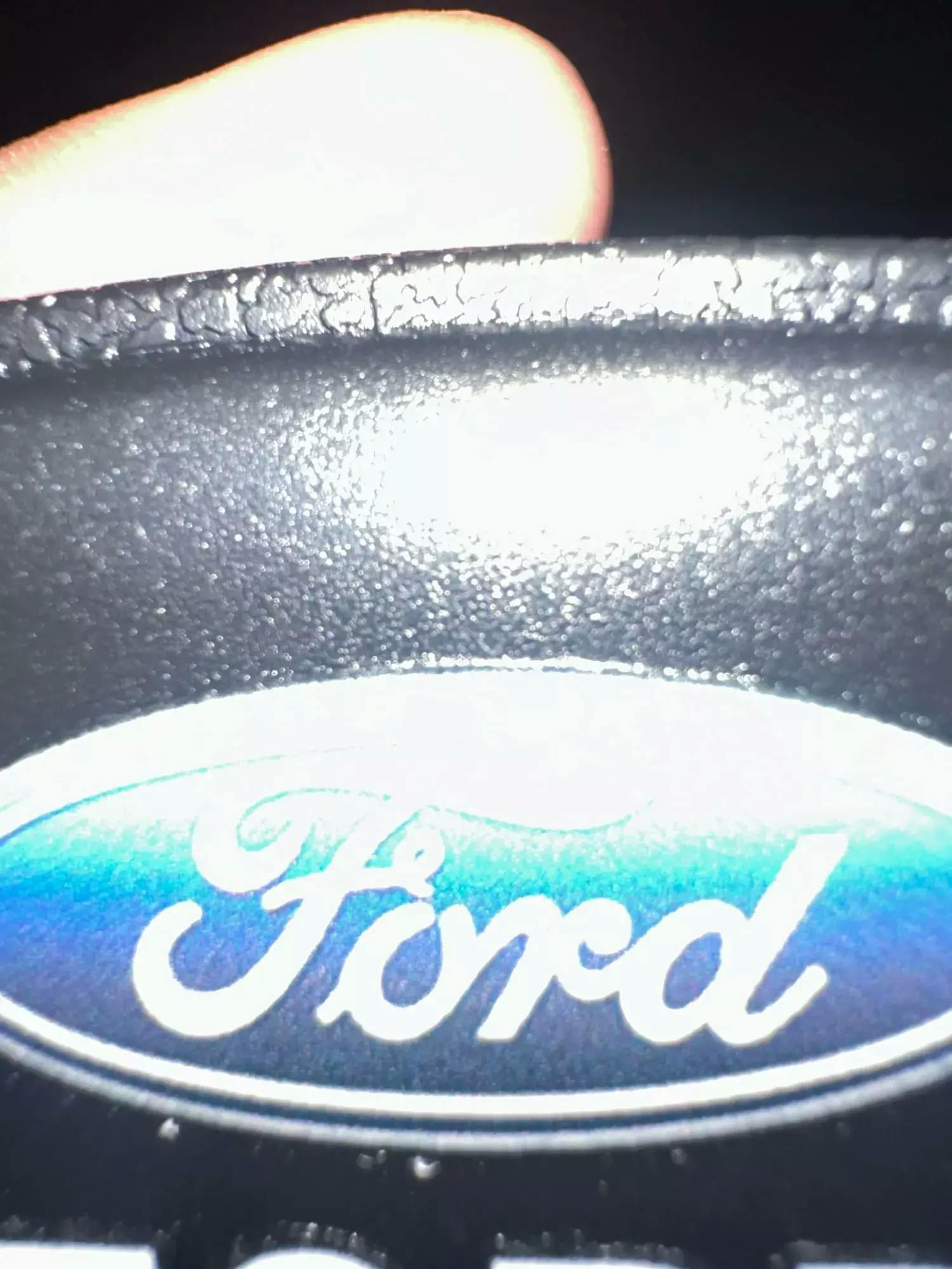 Hochkontrast-Detail – Weißes Ford-Logo auf schwarzem Hintergrund für einen markanten, auffälligen Look.